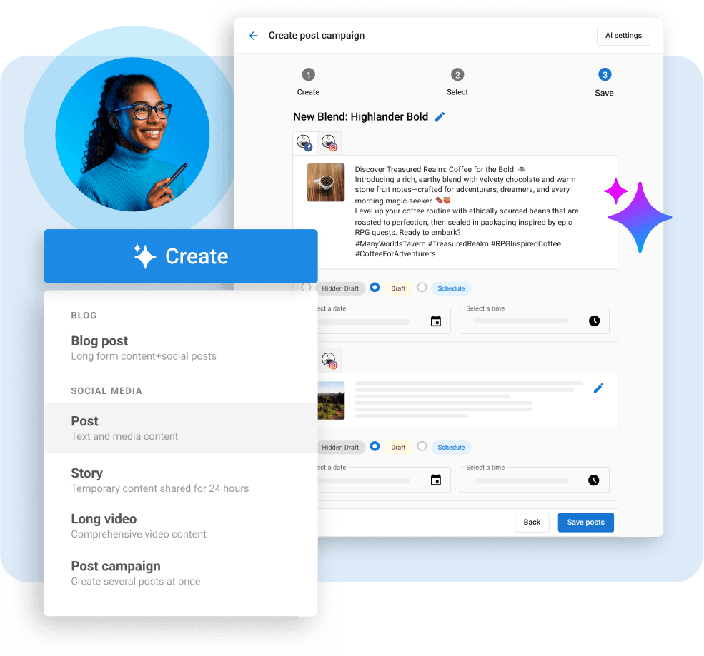 • Generate, schedule, and publish AI-powered posts across multiple client accounts to keep brands active and on-point.